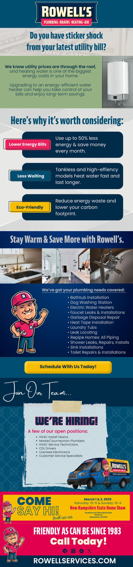 "Friendly As Can Be Since 1983!" When you need help with your plumbing, drains, heating, cooling or electrical in Warner, you can always rely on Rowell's Services! Call us now or book online!